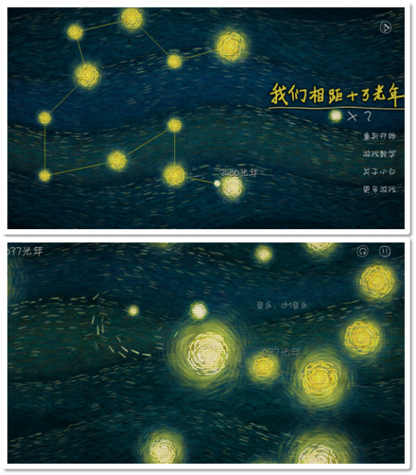 我们相距十万光年You Are 100k Light Years Away来自国内开发者Luo Zhi En,走的一贯的唯美风格,这个游戏玩法简单,画面很有梵高的味道,音乐不错。