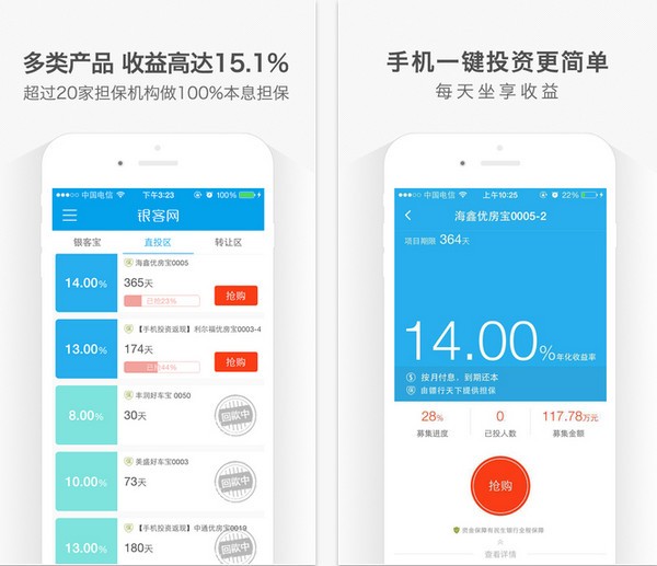 银客网app拥有20家机构为您100%本息担保,高达15.1%的收益在这等您抢。在家只需动动手指,便可轻松理财。收益高,平台很安全,现在闲钱全投银客了,而且提现免手续费,其他家都还在收费。依托金融信息化创新技术,银客网为广大用户提供“低风险、高收益、易理解、最透明、多样化”的互联网理财服务,为中国中小微经济体解决融资需求问题。