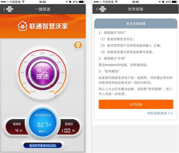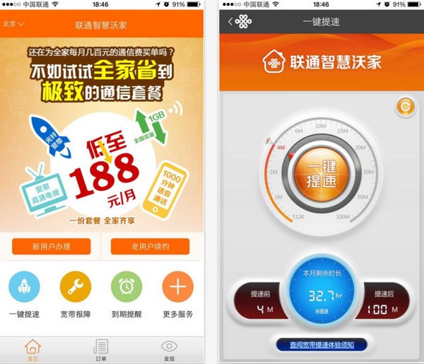 联通智慧沃家app支持新用户办理和老用户续约升级。联通智慧沃家app宽带免费提速100M,联通智慧沃家app在接入北京联通家庭宽带的wifi网络环境下,打开联通智慧沃家点击一键提速,即可将下行带宽最高提升至100M。
