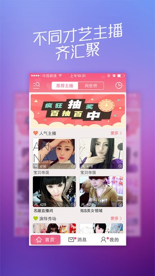 呱呱秀场手机版作为国内知名的视频互动交友平台,结合了当下最热门的视频和社区交友概念,呱呱秀场手机版将视频应用到社区中,集互动娱乐、真人视频为一体,致力于以视频互动社区技术 ,为用户提供婚恋交友、在线K歌、互动游戏等内容。