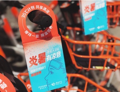 墨迹天气“35度计划,共享清凉“行动,墨迹天气联手ofo、摩拜、bluegogo,在北京、上海、广州、深圳、武汉、成都、广州七大城市,共投放了30000台“清凉单车”,套上专门定做的凉感凝胶清凉坐垫和凝胶冰凉贴挂件。给共享单车换上清凉包装,让人们在炎炎夏日里清凉骑行。墨迹天气联合三家共享单车在全国各地共投放了近30000台“清凉单车”,按照每辆单车日均使用4-6次来计算,墨迹天气的此次活动期间,为近200多万单车骑行者提供了清凉体验。