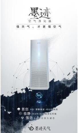 墨迹天气发布首款大气预警空气净化器,将专业的气象分析能力和庞大的气象、用户大数据应用到空气净化领域,首创AQI(空气质量)预警即时推送功能,可实现48小时AQI预测,使用户、环境和墨迹天气之间产生更多的信息交互,打造大气环境管理闭环。
