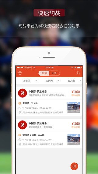 约足球app 25.2M 约足球苹果版下载,约足球app是一款专注于足球的手机应用软件,约足球app给广大足球爱好者提供一个一起约球的平台。主要涉及的服务领域有约球功能、裁判功能、拉拉队支持、球场预定、场地合作、平台圈子、积分换购升级、在线商城等;您可以免费下载。