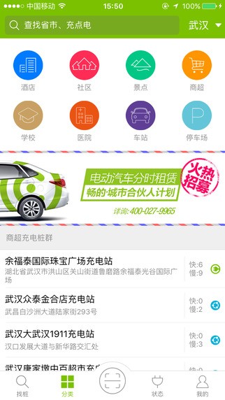 2、分类检索:针对更进一步的站点查询需求,畅的充电依据酒店、景点、商超、医院、学校等等功能性分类将充电站点逐一分类,为有特殊需求的用户提供便捷的查询通道;