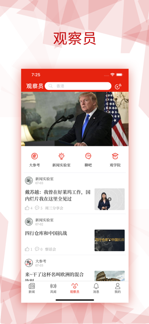观察者网app是一款新闻资讯阅读软件,观察者网手机版致力于荟萃中外思想者精华,鼓励青年学人探索,建中西文化交流平台,为崛起中的精英提供决策参考。