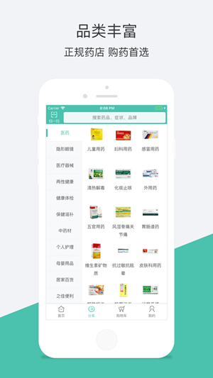 在线购药,品类齐全,涵盖一万五千多种优质上架药品,包括男科用药、心血管科、糖尿病科、内分泌科、肿瘤科药、皮肤科药、消化系统、神经系统、呼吸系统、泌尿科药、女性用药、儿科用药、滋补保健等等,常用药、专科药一应俱全,涉及医药领域方方面面,让用户一站式购健康。