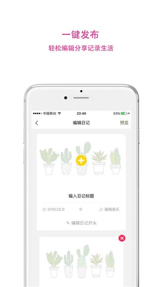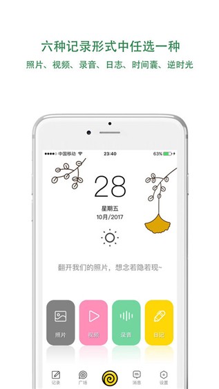 是国内目前唯一一款记录生活点滴事物的APP。与家人恋人同学一起记录、分享,同时可以达到彼此关爱彼此联系的作用。以图片、文字、录音、视频四种方式随心记录,不会错过生活中任何一刻美好的时光。可以一键上传照片,永久珍藏与自己相关的美好回忆,上传到云端,不仅可以省下手机内存,还具有很强的安全性。同时也可以通过隐私设置来决定是否公开给陌生人浏览自己的动态,通过相同爱好寻找与自己志同道合的好友和圈子。