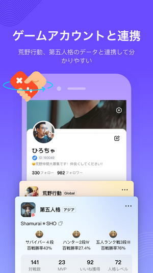 轻松直接地与荒野行为和第五人格等数据链接!您和其他用户的游戏数据一目了然,使交流更加便捷,您一定会找到适合您的玩家!