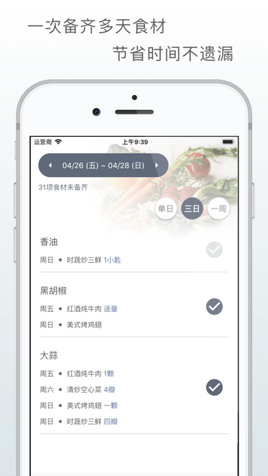 将食材一并记录在应用中,私厨会帮您统整每天,每周的备料清单,让您购物时能够一次买齐所有食材,也不会漏掉某些材料,备料变得更轻松!