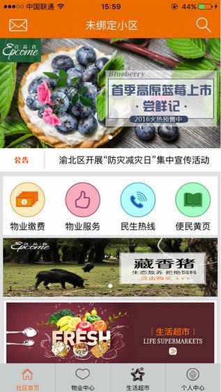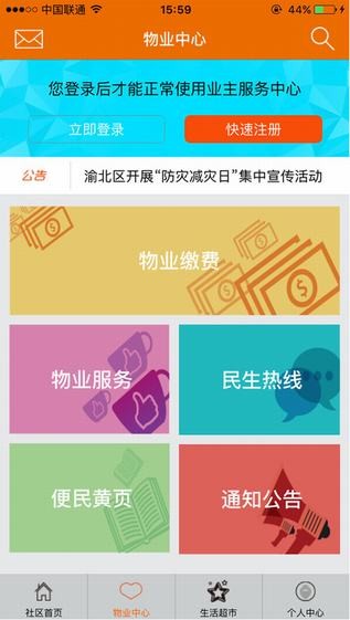 1、提供物业缴费、物业服务、民生热线、便民黄页等便民服务功能