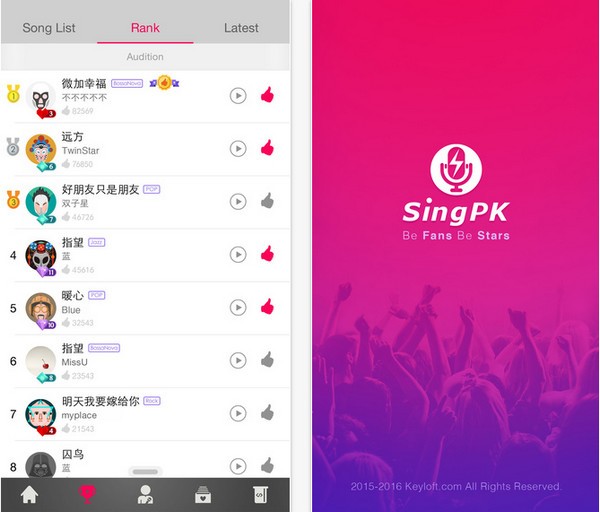 SingPK app就是一款手机上的中国好声音,在SingPK app你不用在乎自己的年龄,职业,身份,只要放声高歌,让世界都听见你的好听的真实的歌声。没准下一个大明星就是你。