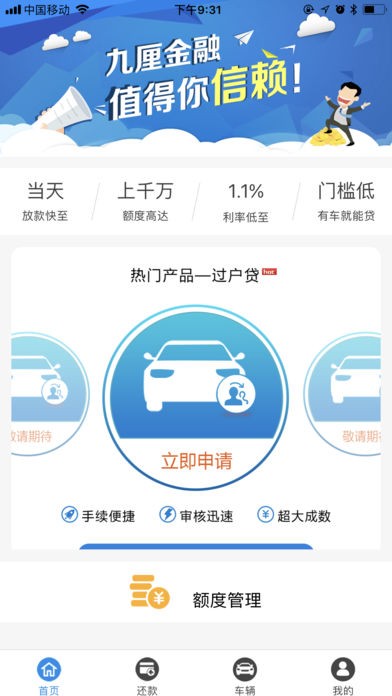 九厘金融app是一款提供商务服务的手机应用。九厘金融app是为优质二手车商用户服务的,你可以通过九厘金融app实现便捷融资,车辆管理等功能。