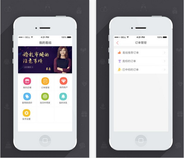 易结商家版app是一款专为婚礼商家打造的应用,易结商家版app上可以随时随地接收用户订单,响应更及时,管理订单、查询订单状态更便捷,消息通知,避免错过重要讯息。
