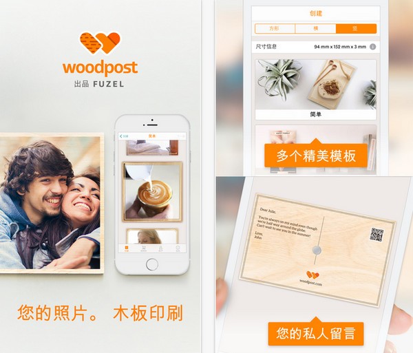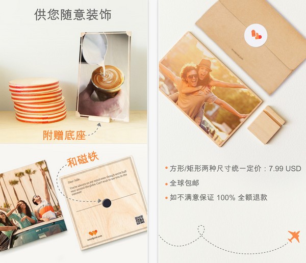 ;; Woodpost app这是一款颇为文艺范的应用, Woodpost app提供一项服务可以将照片打印到木板上面,似乎有那么点文艺范的味道。Woodpost app可以将照片打印到经久耐用的三合板上以便做成卡片,或者打印到牛皮纸上用于包装,这个过程环保健康,色彩和效果都非常逼真。