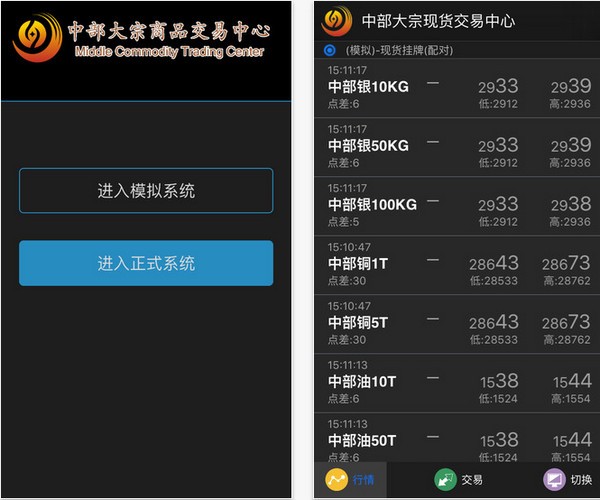 中部大宗商品交易中心app为用户提供了真实的行情报价、账户信息查询、委托交易、公告信息等四个大功能模块、其中实时行情提供了包括交易商品的实时行情报价、账户信息和交易记录查询、持仓单和委托单等,委托交易提供了市价单和限价单的交易方式,让客户充分利用移动互联网的便利,随时掌握了解行情