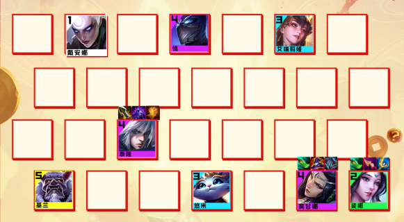 1、阵容组成:风女、刀妹、泰隆、莫甘娜、悠米、基兰、慎、皎月